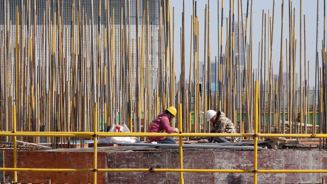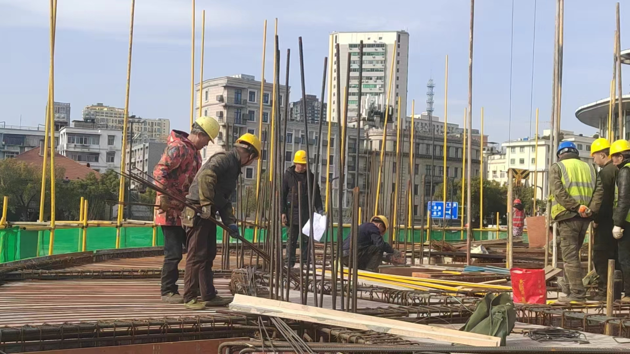 一座塔吊伸展着长长的吊臂,将一捆捆钢筋、模板从运输车上吊起,缓缓地送到指定位置。随着钢筋不断拼接,建筑的骨架逐渐清晰起来。一线作业人员不时地用尺子测量钢筋间距,确保每一根钢筋都精准地符合设计要求。