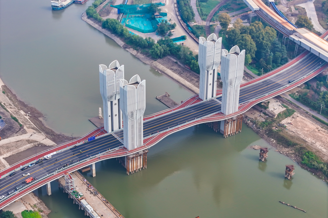 右岸大道开启桥是武钢集团和青山船厂对外运输的重要通道,为保障汛期船舶顺利通航,桥梁必须保障充足的净空高度。为此,项目前期设计阶段反复比选跨港桥梁方案,综合考虑成本造价、船舶通行、沿江景观等因素,最终选定了开启桥方案,既避免了桥梁总长和建设高度的急剧增加,也能够达到临江观江、生态交通和谐统一的景观效果。